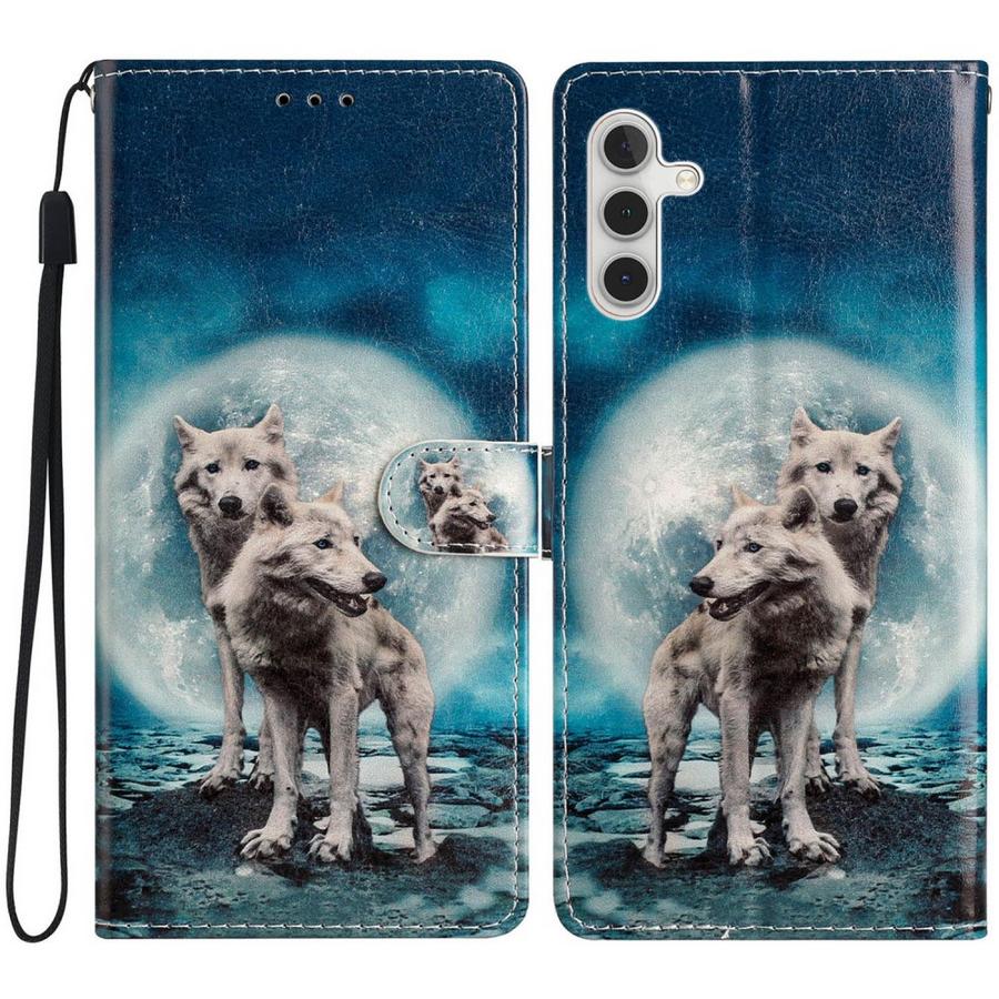 Samsung Galaxy S24 FE 5G -älypuhelimen suojaamista varten kotelo, jonka kansiin on kuvioitu yötaivas ja sudet kuunkajossa.