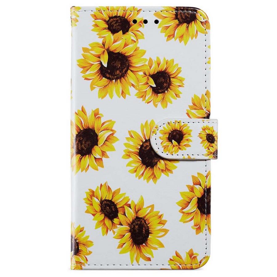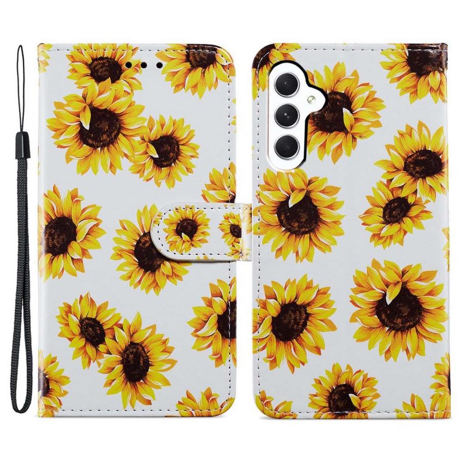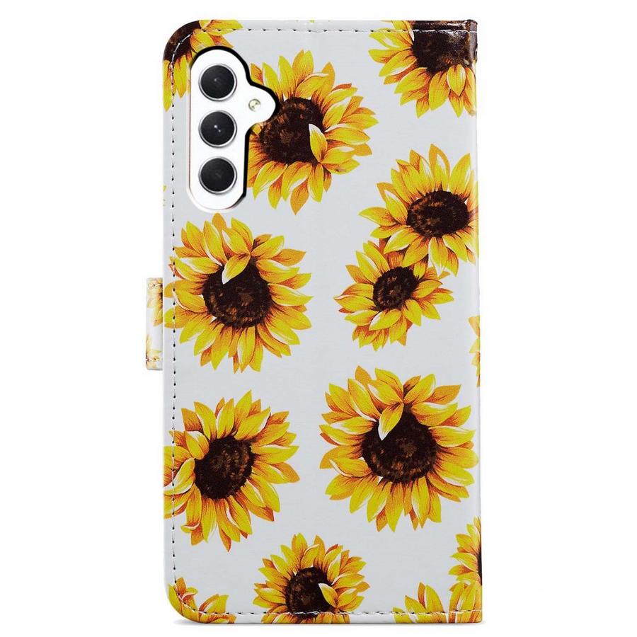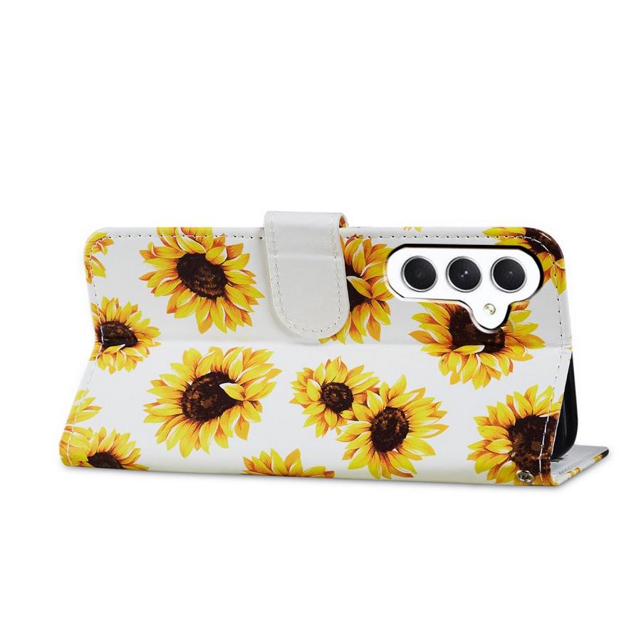 Iloisen kotelon kansia somistavat auringonkukat, Samsung Galaxy S24 FE 5G -älypuhelimen suoja antaa hyvän turvan arjen vahingoilta.