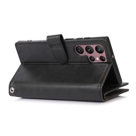 Tilava, ajattoman musta lompakko Samsung Galaxy S24 Ultra 5G puhelimelle, suunniteltu tarjoamaan tyylikäs ulkonäkö ja hyvä suojaus.