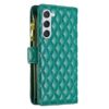 Samsung Galaxy S25 5G puhelimelle erinomaisen suojauksen sisältävä lompakko, jonka ihastuttavan vihreissä kansissa on kaunis vinoruudutettu kuviointi.