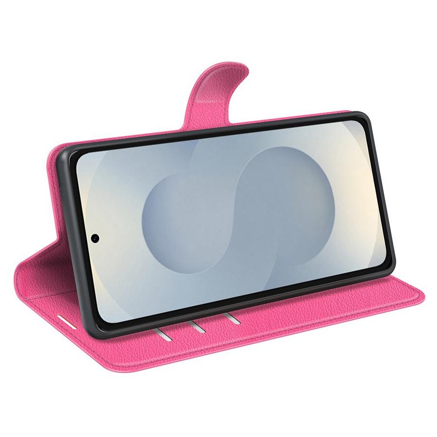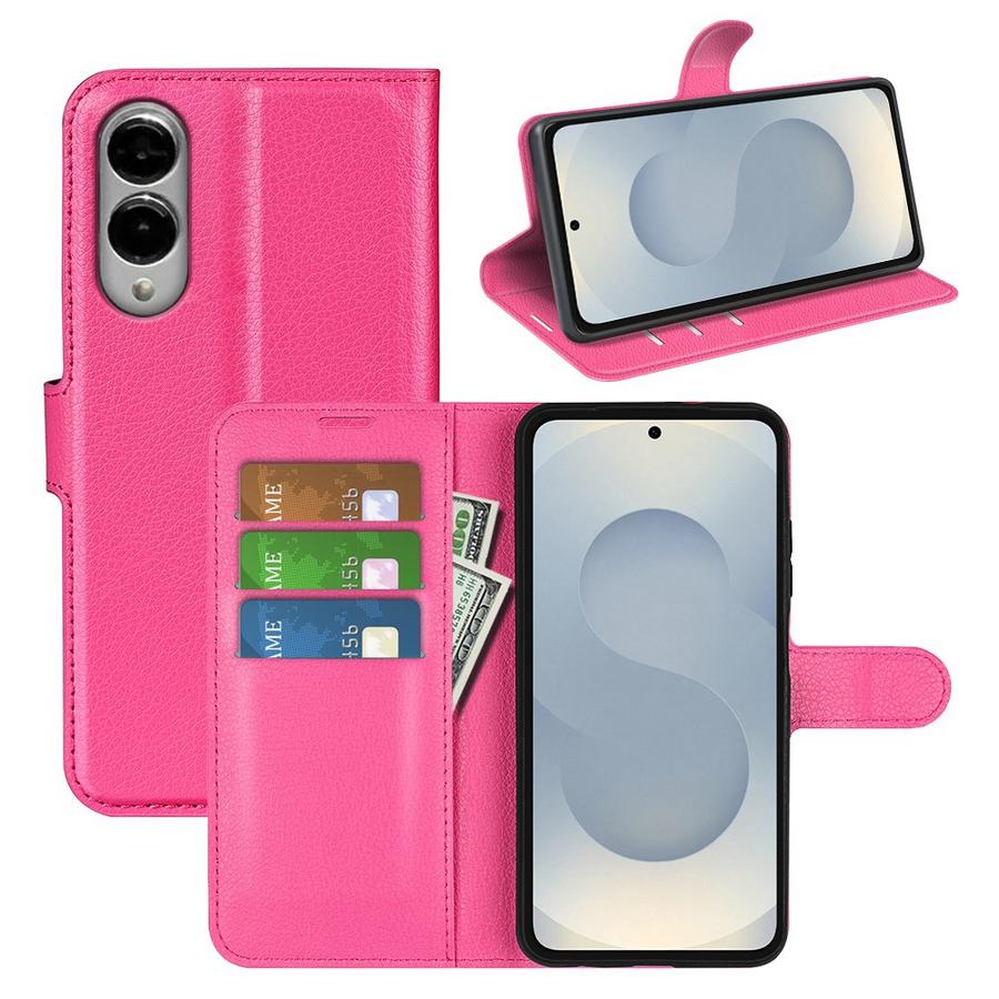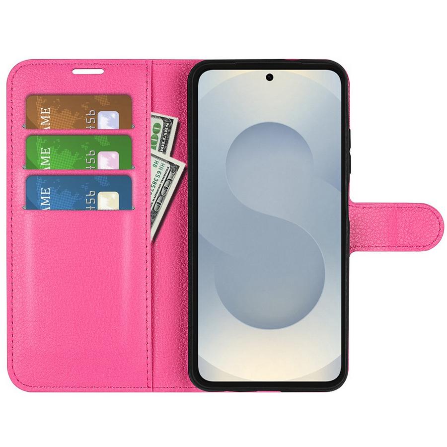 Samsung Galaxy S25 Edge 5G puhelinmallille särkymiseltä ja naarmuuntumiselta suojaava lompakkokotelo pirteissä pinkin värisissä kansissa.