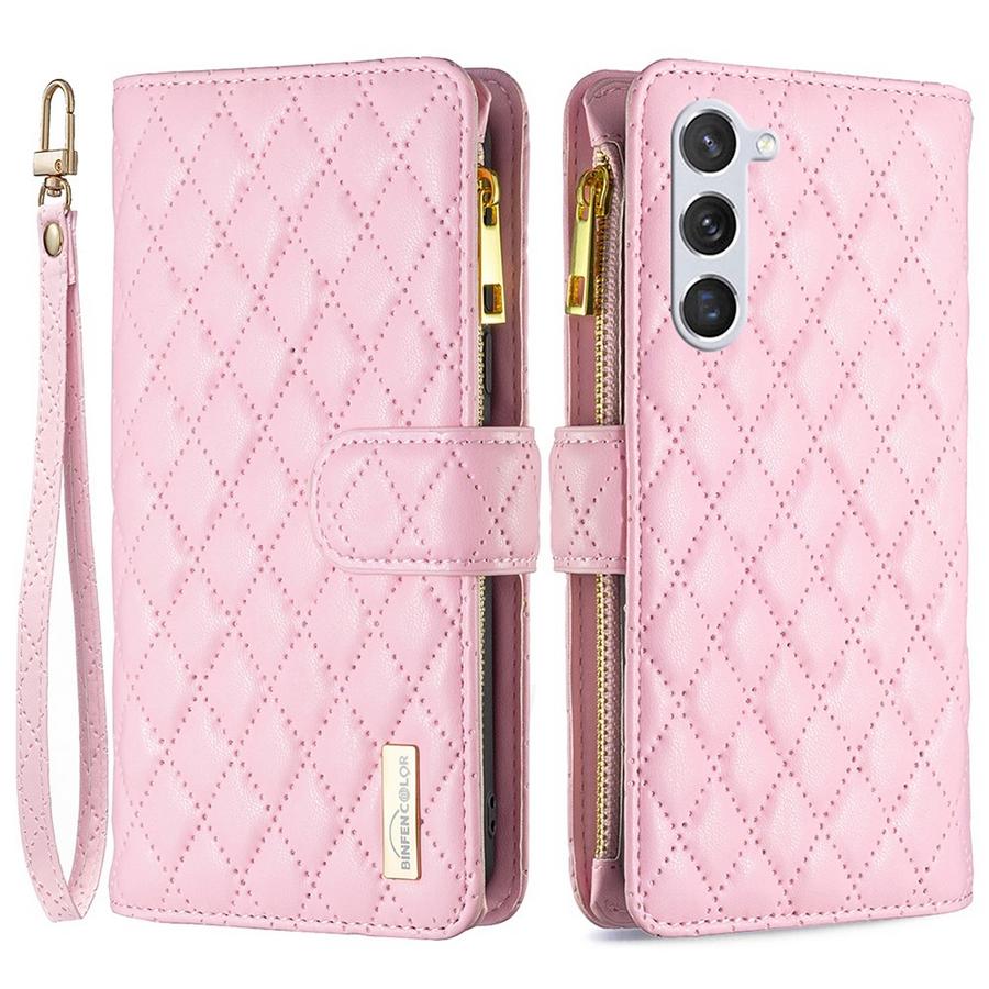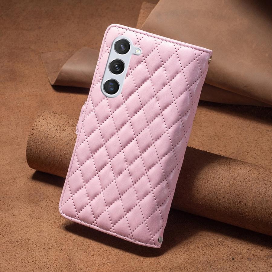 Suloisen vaaleanpunaisen värinen lompakko kauniilla ruutukuvioinnilla, sisältää erinomaisen suojan Samsung Galaxy S25+ 5G puhelimelle.