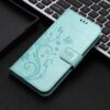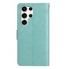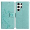 Samsung Galaxy S25 Ultra 5G puhelimelle soveltuva suojaava lompakkokotelo raikkaassa turkoosin värissä, somisteena painettuja kukkia ja perhosia.