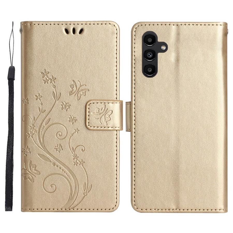 Ihanasti perhosin ja kukkasin painokuvioitu, kullankiiltävä lompakkokotelo Samsung Galaxy S26+ 5G puhelinmallia suojaamaan.