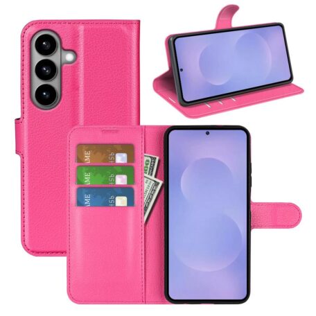 Napakka lompakkomallinen kotelo piristävän pinkin värisillä kansilla turvaa Samsung Galaxy S26 5G -älypuhelimen vahingoittumiselta.