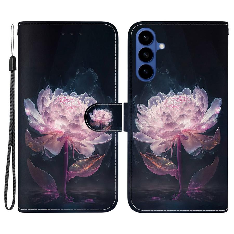 Mustissa kansissa hohdokas vaaleanpunainen kukkakuvio, suojakotelo Samsung Galaxy S26 5G puhelimelle pitää sen turvassa osumilta.