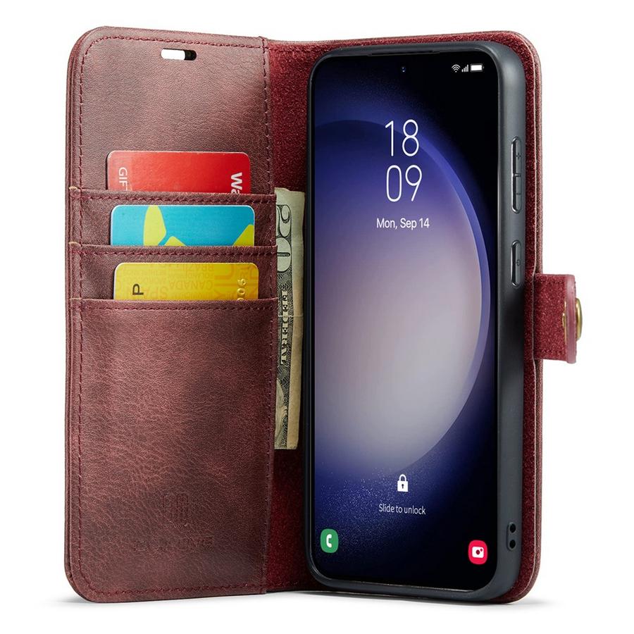 Kauniin viininpunainen kotelo on Samsung Galaxy S26+ 5G puhelimen luja suoja, jossa yhdistyvät takakuoren ja lompakkomallin parhaat puolet.