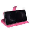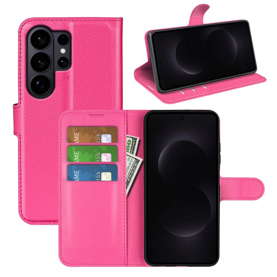 Napakka lompakkomallinen kotelo piristävän pinkin värisillä kansilla turvaa Samsung Galaxy S26 Ultra 5G -älypuhelimen vahingoittumiselta.