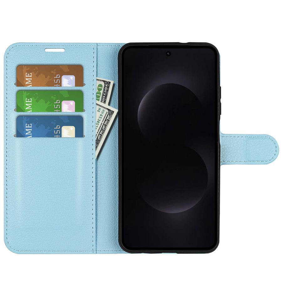 Käytännöllinen, lompakkomallinen kotelo vaaleasävyisen sinisillä kansilla suojaa pätevästi Samsung Galaxy S26 Ultra 5G -älypuhelimen osumilta.
