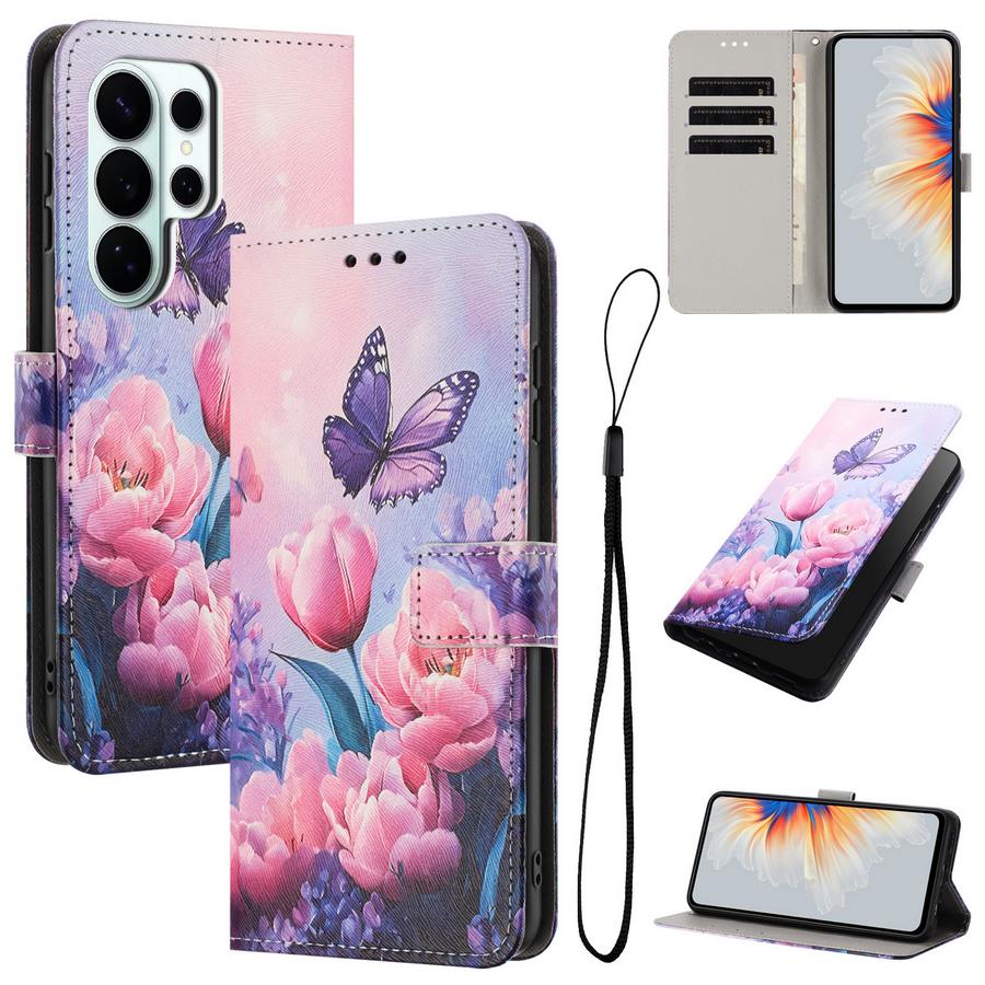 Tulppaaniniityn yllä lentelevät perhoset ja hempeä värimaailma, Samsung Galaxy S26 Ultra 5G puhelinta vahingoilta suojaava suloinen kotelomalli.