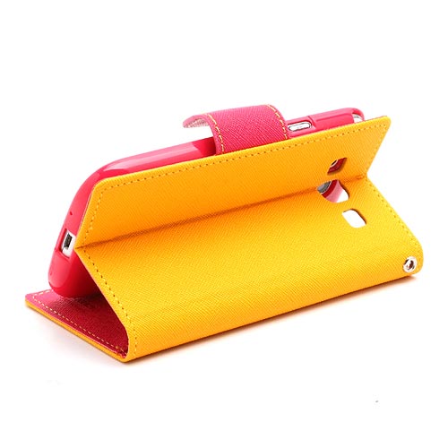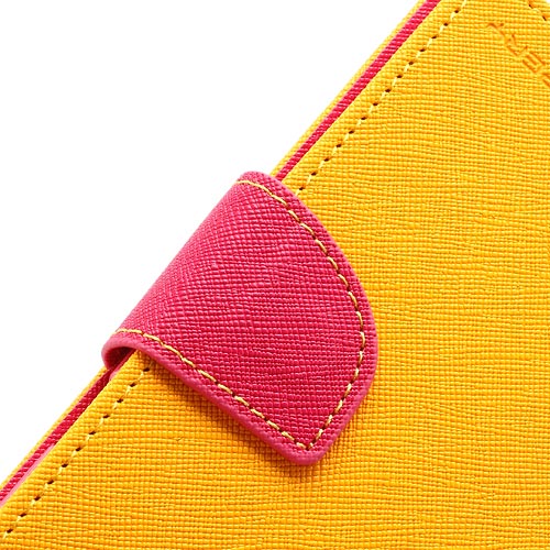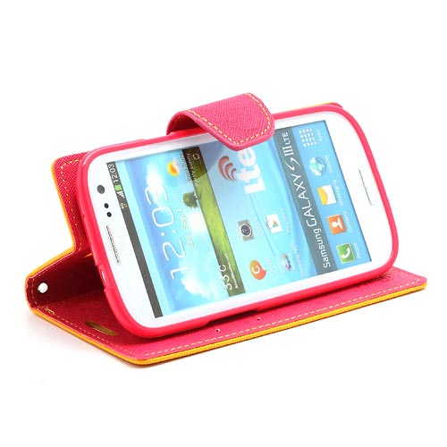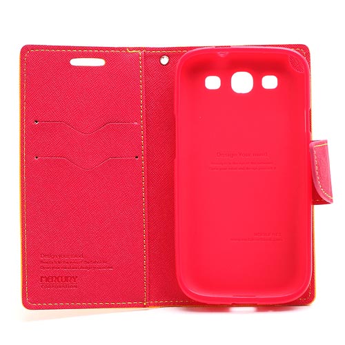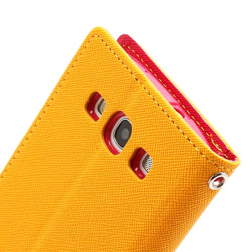 Laadukas keltainen Mercury Goospery Fancy Diary lompakkokotelo Samsung Galaxy S3 älypuhelimeen. Kotelon sisäosa on pinkki.