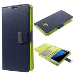 Tyylikäs ja laadukas Goospery Rich Diary suojakotelo Samsung Galaxy S7 Edge puhelimeen on tummansininen ulkoa ja vihreä sisältä.