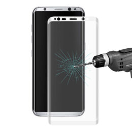 Suojaa Samsung Galaxy S8 älypuhelimen näyttö tehokkaasti koko näytönalan peittävällä kaareutuvalla Hat Prince lasikalvolla, jossa on valkoinen reunus.