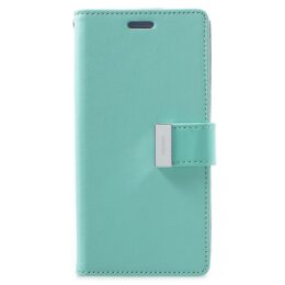Turkoosissa Goospery Rich Diary lompakkokotelossa säilytät useita kortteja ja kuitteja ja sillä suojaat Samsung Galaxy S9 älypuhelimen iskuilta.