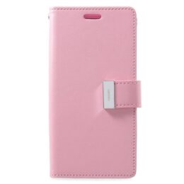Samsung Galaxy S9 vaaleanpunaisessa Goospery Rich Diary kotelossa on viisi korttipaikkaa, kuitti-/setelitasku ja magneettiläpällä sulkeutuva kansi.