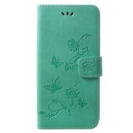 Samsung Galaxy S9+ älypuhelimeen sopivassa turkoosissa kukka kotelossa on kaksi korttipaikkaa, tasku, jalusta-toiminto, magneettisuljenta ja rannehihna.