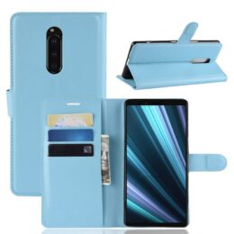 Vaaleansinisellä lompakko suojakotelolla suojaat Sony Xperia 1 älypuhelimen kolhuilta ja naarmuilta tyylillä.