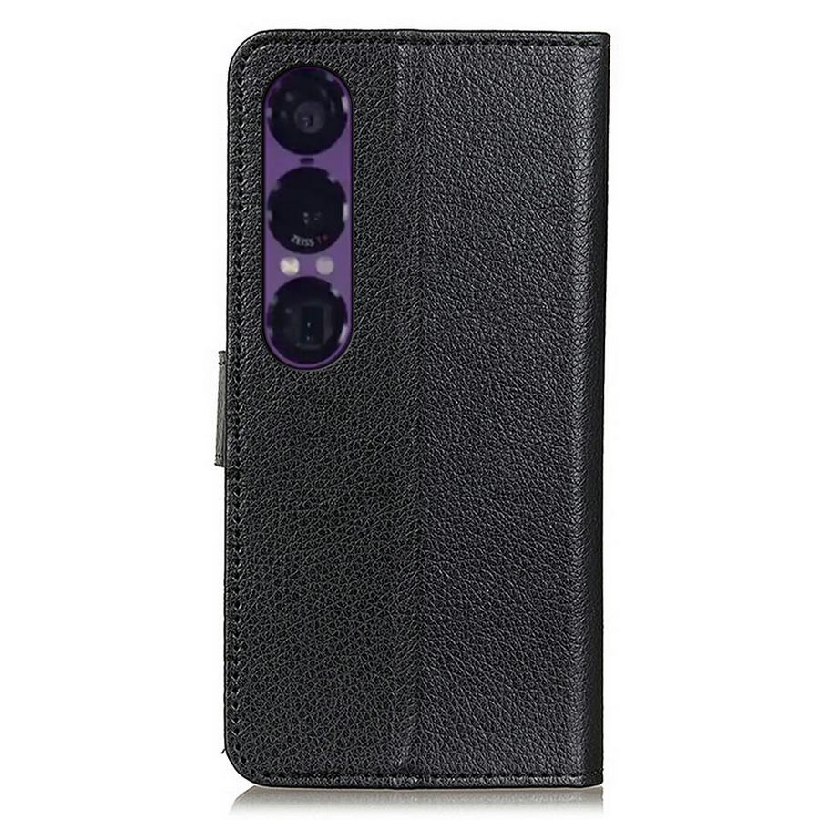 Klassinen mustakantinen lompakkokotelo on tyylikäs ja käytännöllinen rikkoutumisen suoja Sony Xperia 1 VII -älypuhelimelle.
