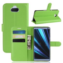 Vihreällä PU-nahasta valmistetulla lompakkokotelolla suojaat Sony Xperia 10 älypuhelimen tyylillä.
