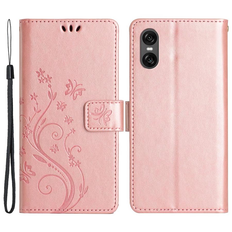 Pirteän väriset kannet somistettuna kukkasilla ja perhosilla, suojaava lompakkokotelo estämään Sony Xperia 10 VI puhelimen vaurioituminen.