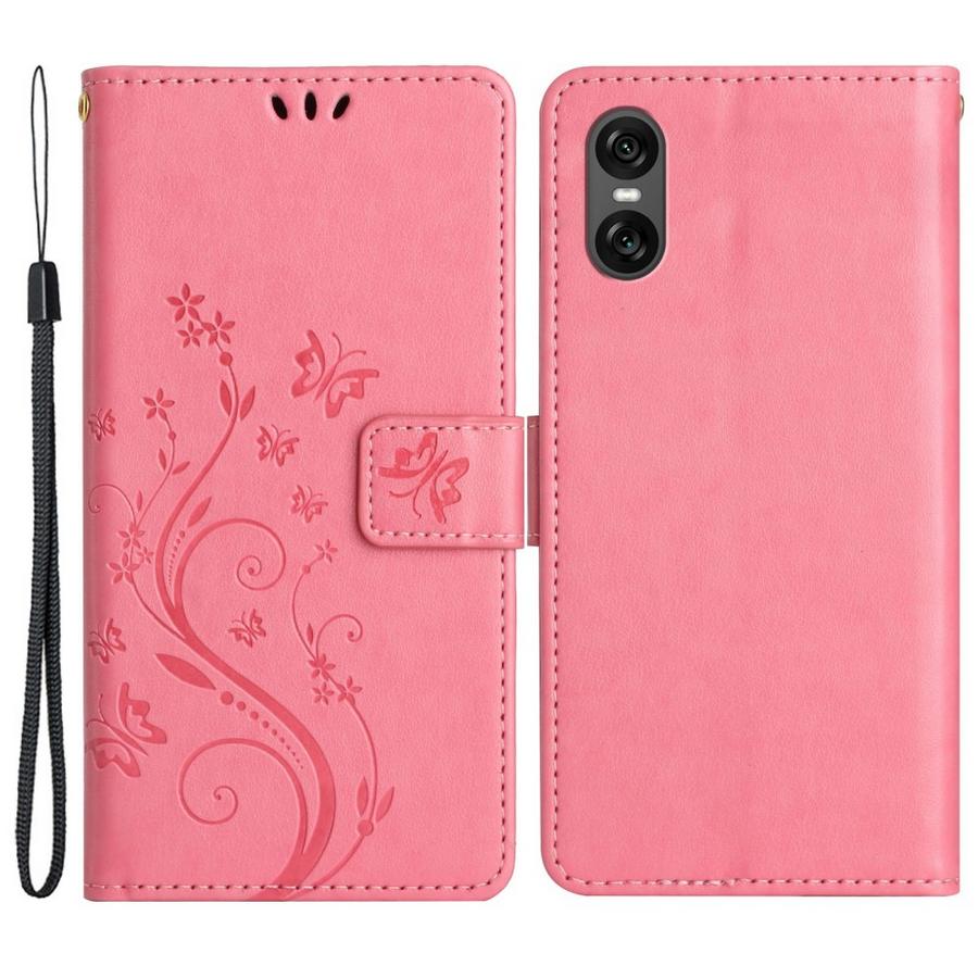 Painokuvioiduilla perhosilla ja kukilla somistettu kullankiiltoinen lompakkokotelo tuo ylellisyyttä Sony Xperia 10 VI puhelimen suojaamiseen.