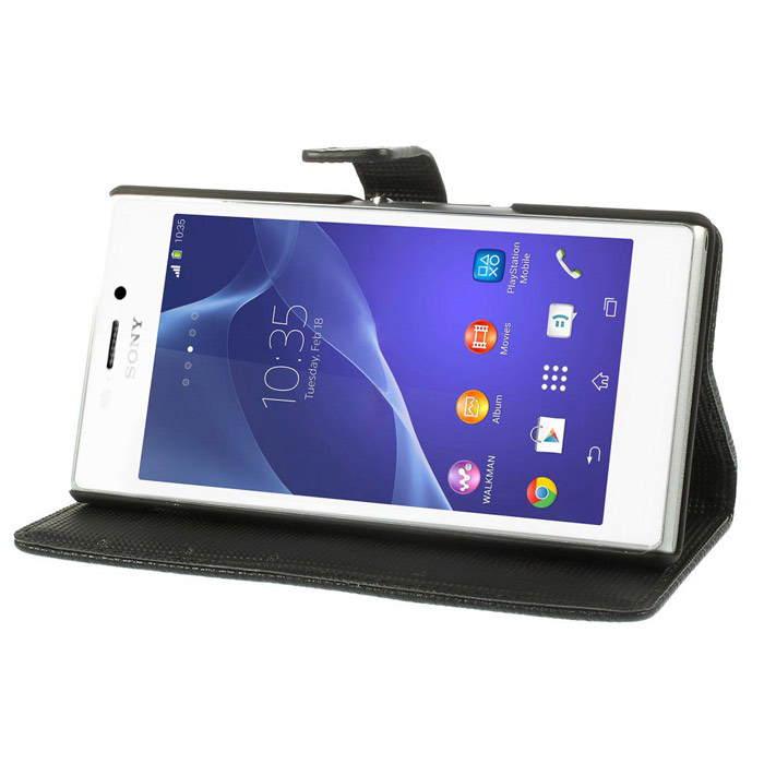 Mustalla lompakkokuorella suojaat Sony Xperia M2 puhelinta iskuilta ja naarmuilta.
