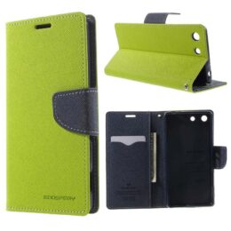Sony Xperia M5 puhelimeen sopivassa vihreässä Goospery Fancy suojakotelossa on kaksi korttipaikkaa, magneettikiinnitys ja jalusta-ominaisuus.