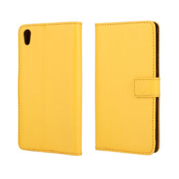 Keltaisella aidosta nahasta valmistetulla lompakkokotelolla suojaat Sony Xperia Z5 puhelimen putoamisilta ja kolhuilta.