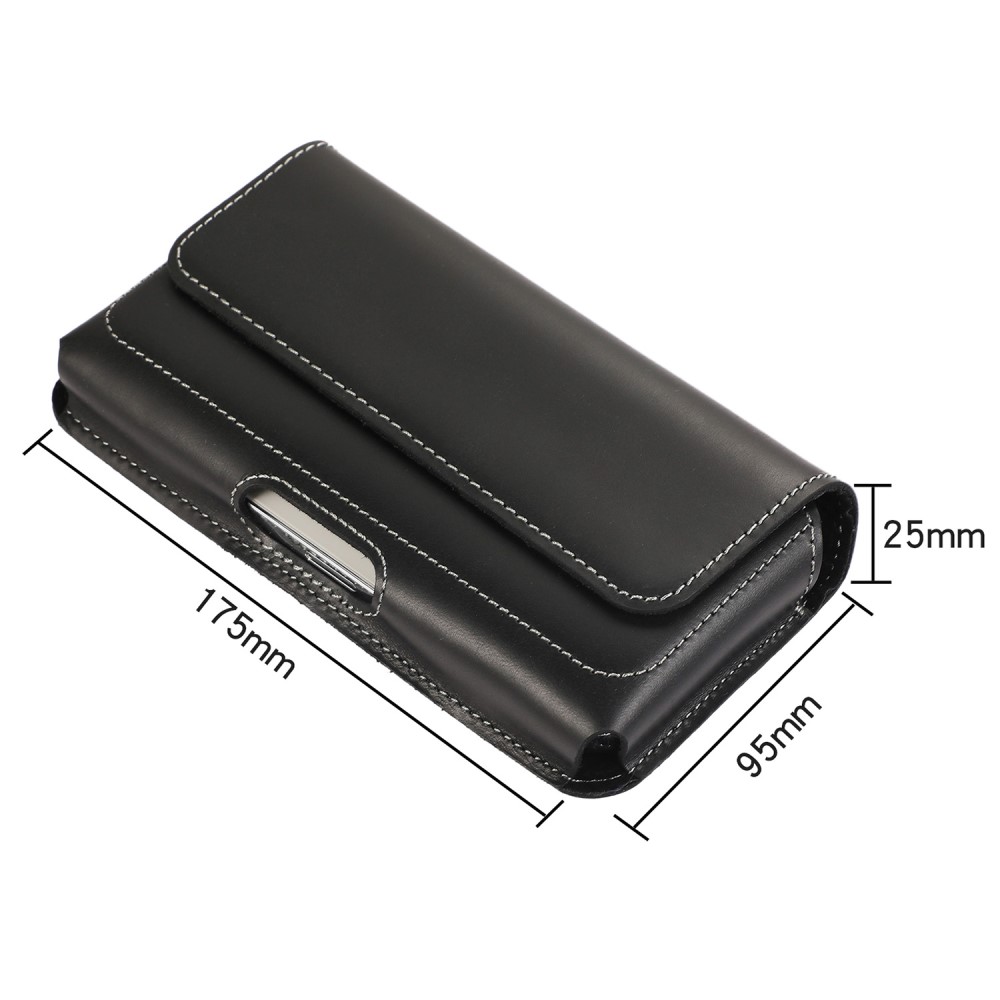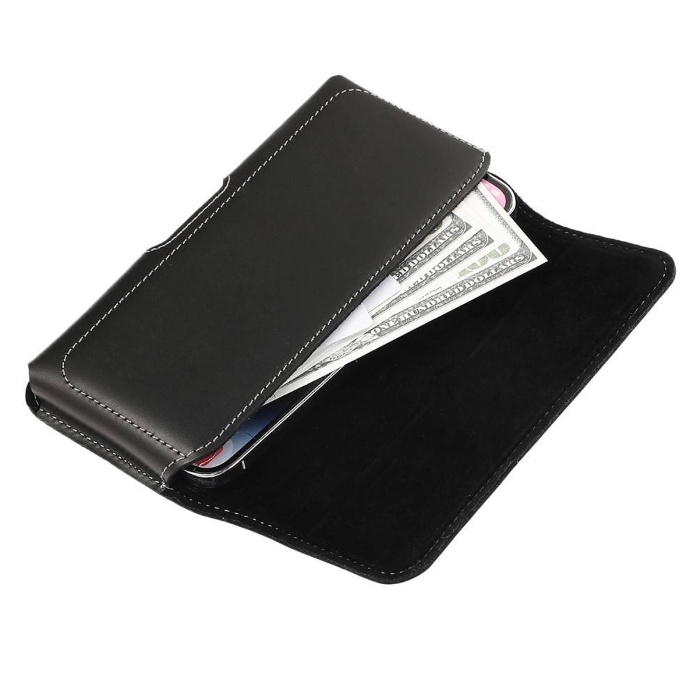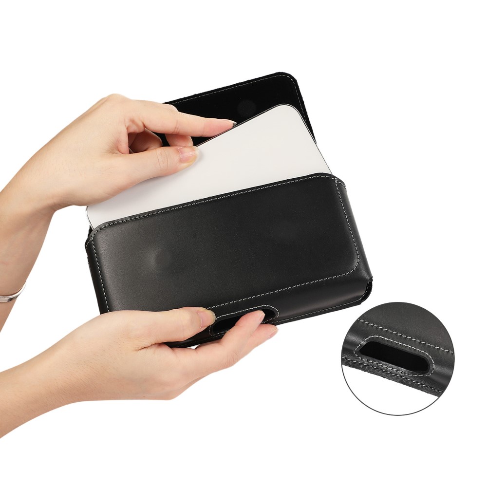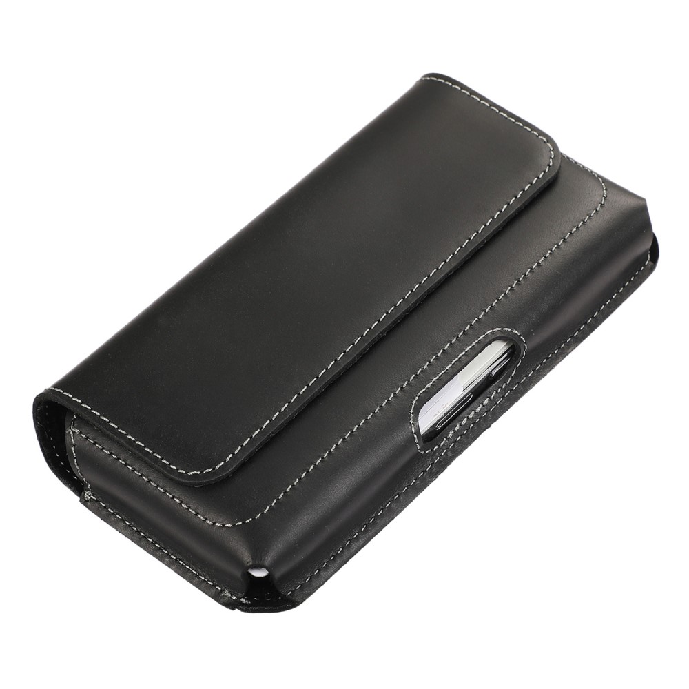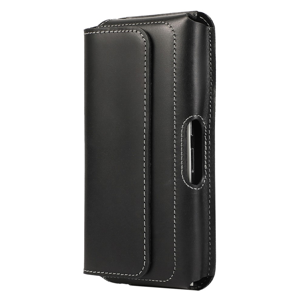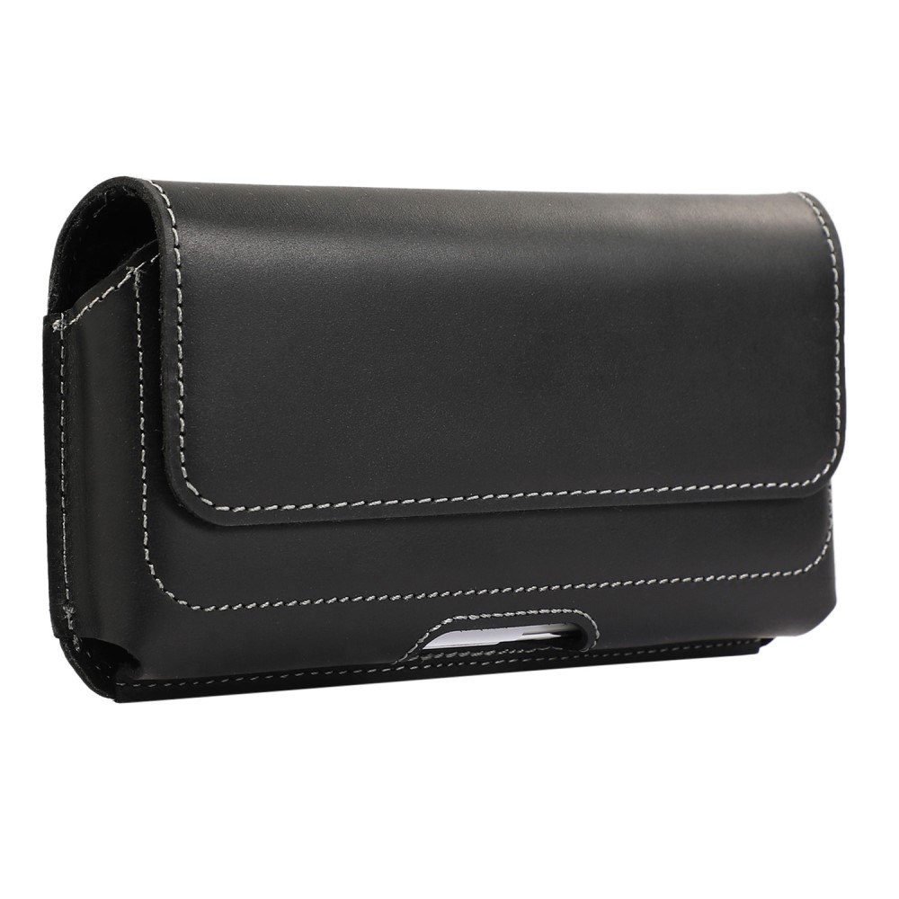 Laadukas aidosta nahasta valmistettu suuri musta vaakalaukku mallinen vyökotelo, johon mahtuu suurempikin puhelin kuorien kanssa.