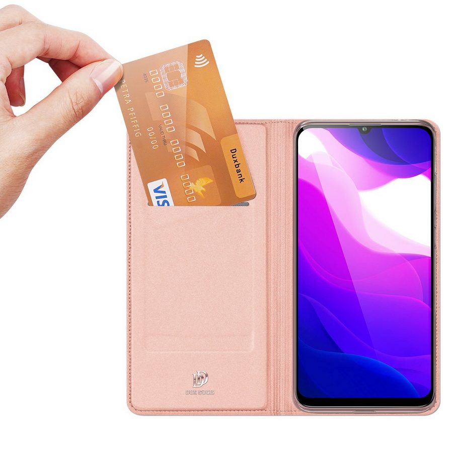 Xiaomi Mi 10 Lite 5G puhelimeen sopivassa vaaleanpunaisessa kotelossa on kolme korttipaikkaa, kuittitasku, kannen magneettisuljenta ja jalusta-toiminto.