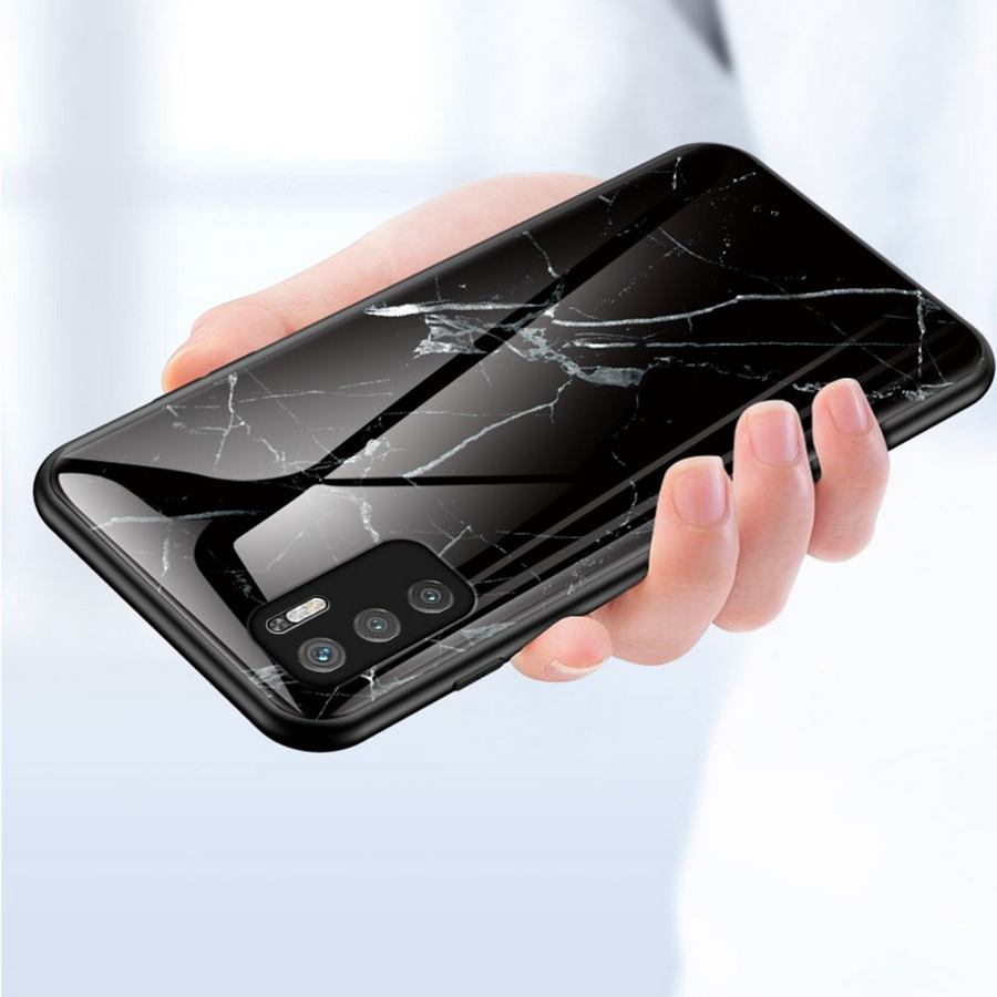Äärimmäisen upean näköinen tummapintainen, valkeiden marmorikuvioiden halkoma takakuori Xiaomi Redmi Note 10 5G puhelimen turvaksi.