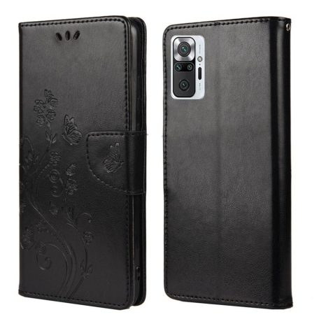 Mustan kotelon ilmeeseen on saatu tyylikkäästi eloa painetuilla kukka- ja perhoskuvioilla, napakka suojatuote Xiaomi Redmi Note 10 Pro puhelimelle.