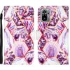 Xiaomi Redmi Note 10S puhelimen suojaksi soveltuvassa lompakkokotelossa on upeasti violetin eri sävyjä ja marmorikuvioita.
